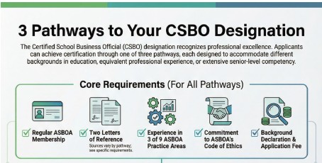 ASBOA's designation of Certified School Business Official (CSBO) recognizes school business officials who demonstrate a combination of experience and education and who have the essential knowledge in the areas of practice in the profession of school business.